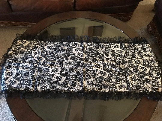 *Made of flannel with various scattered Tarot cards containing; black widow spider, Hamsa hand, skulls, black cat, the moon and stars, crystals and a pentacle.