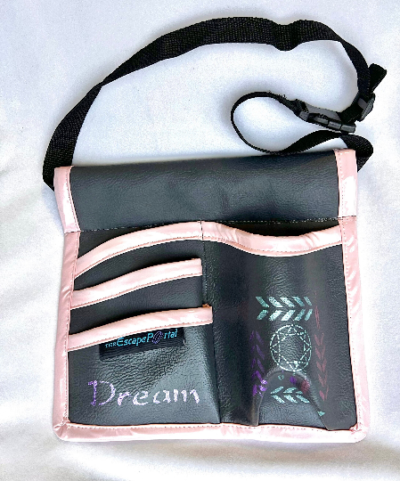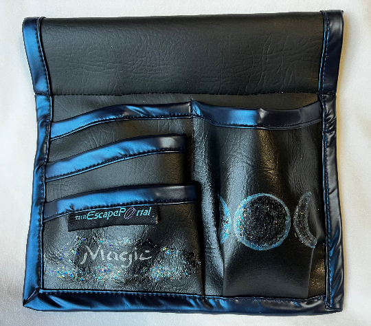 *One large pocket for lotion, hand tools or a water bottle and three smaller pockets for; cellphone, EOs, biz cards, crystals or whatever you bring as a healer, assistant or artist.